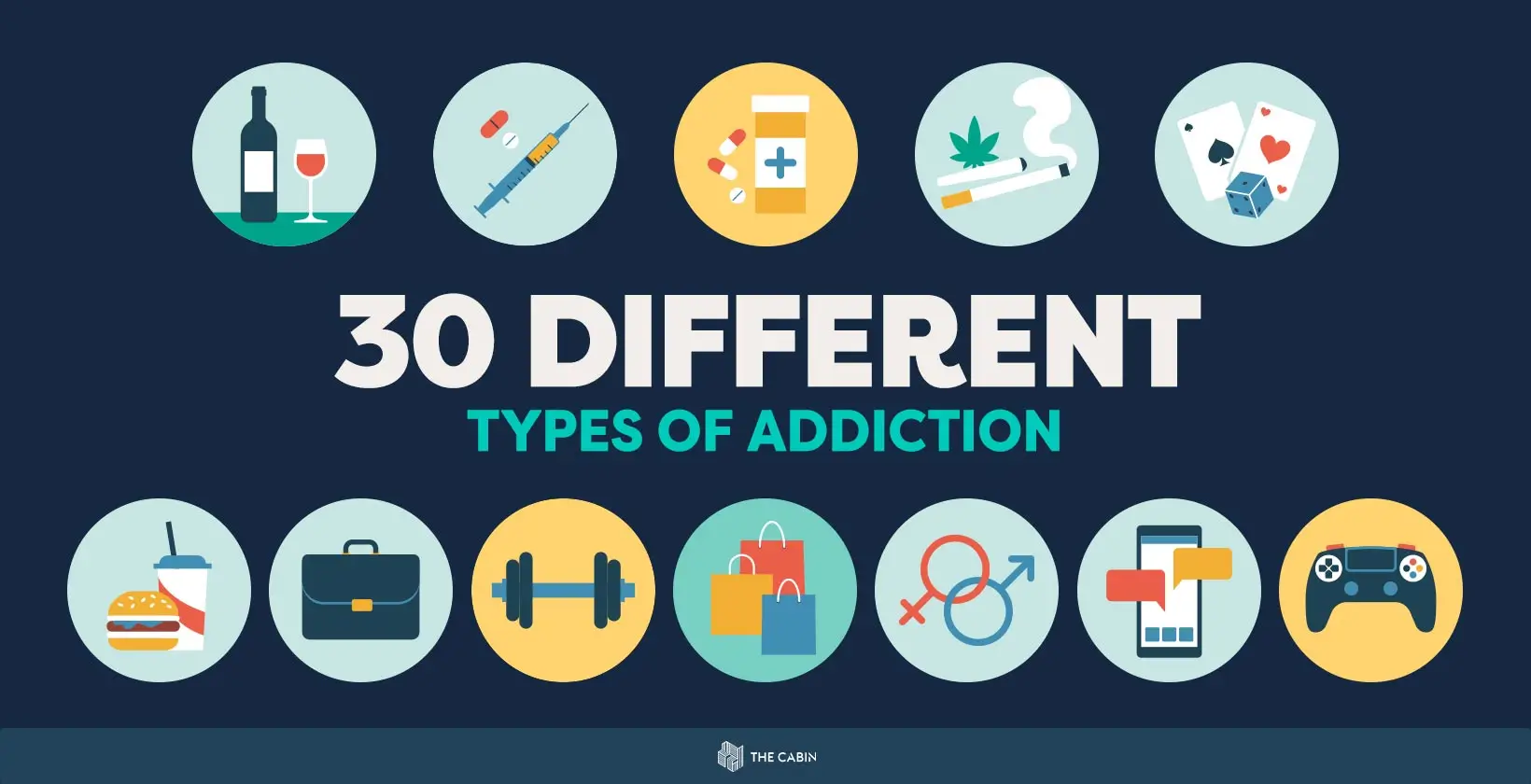Different types of addiction involve physical (chemical dependency) and behavioral forms.